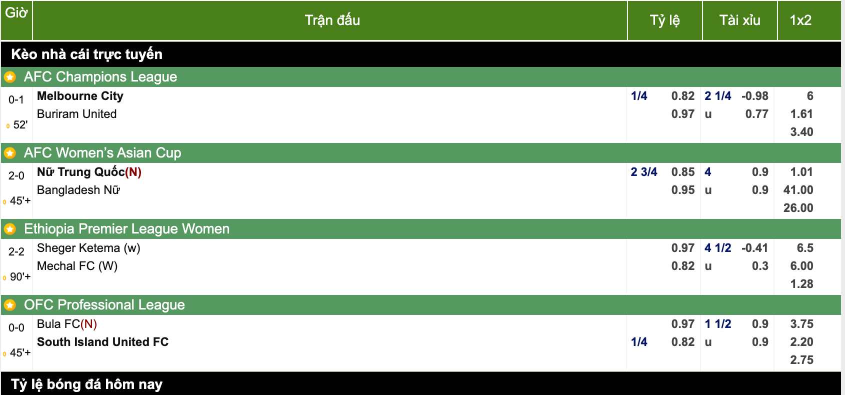 | 15/04 01:30 | vs | Nữ Scotland - Nữ Bỉ | 0.9 | 0:1/4 | 0.9 | ||||||
